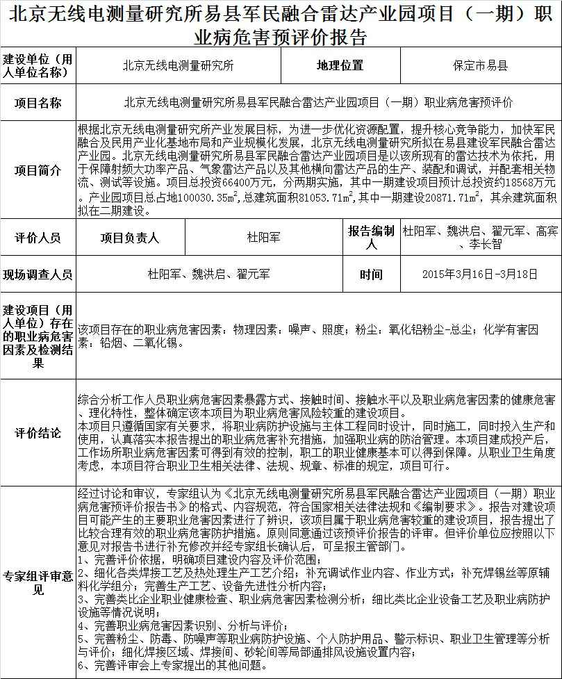北京无线电测量研究所易县军民融合雷达产业园区项目(一期)建设项目职业病危害预评价
